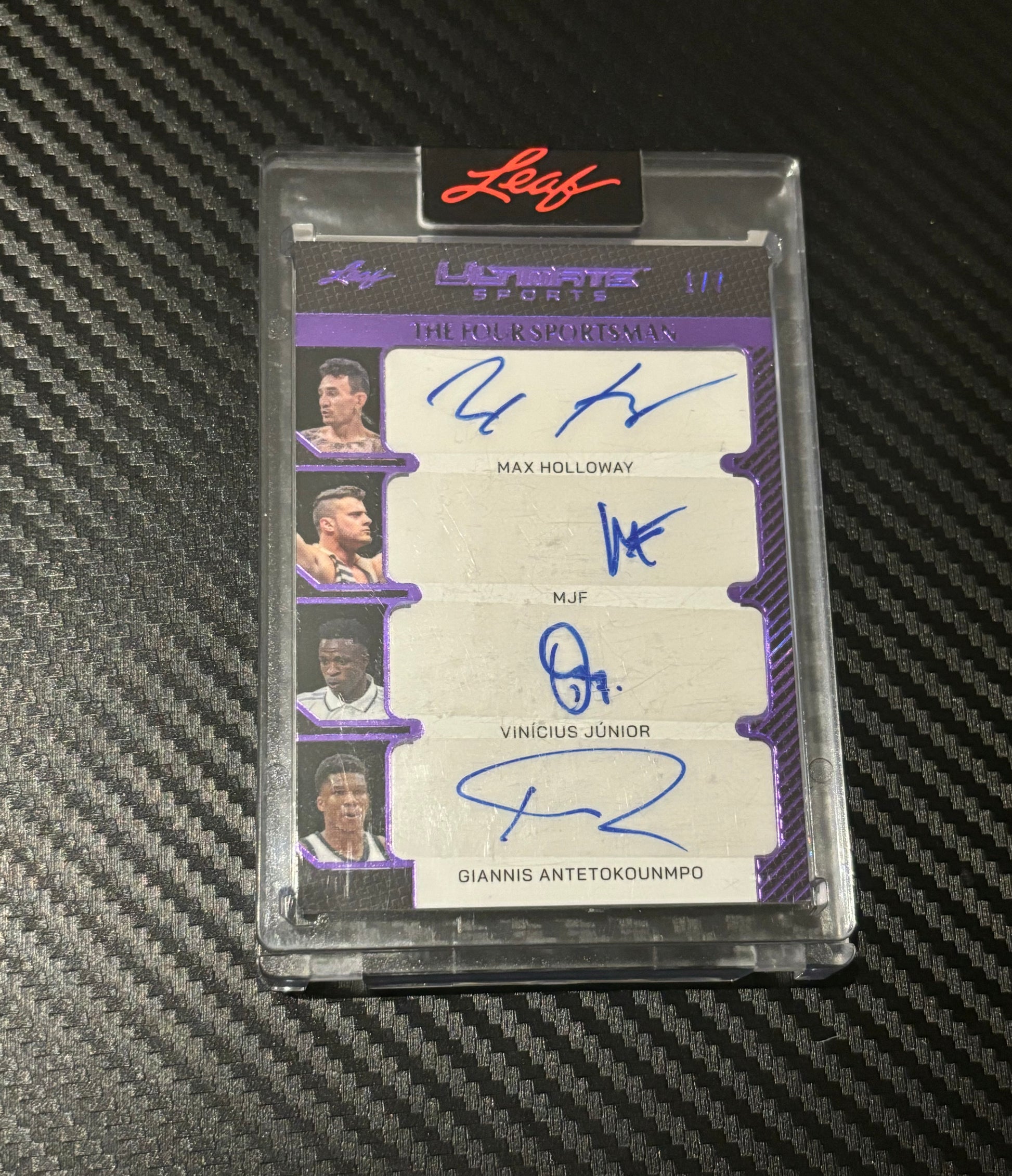 This 2024 Leaf Four Sportsman Quad Auto features autographs from top athletes Holloway, MJF, Vini Junior, and Antetokounmpo, making it a rare collectible with only 7 copies produced. Perfect for sports fans and collectors seeking valuable and limited-edition memorabilia.