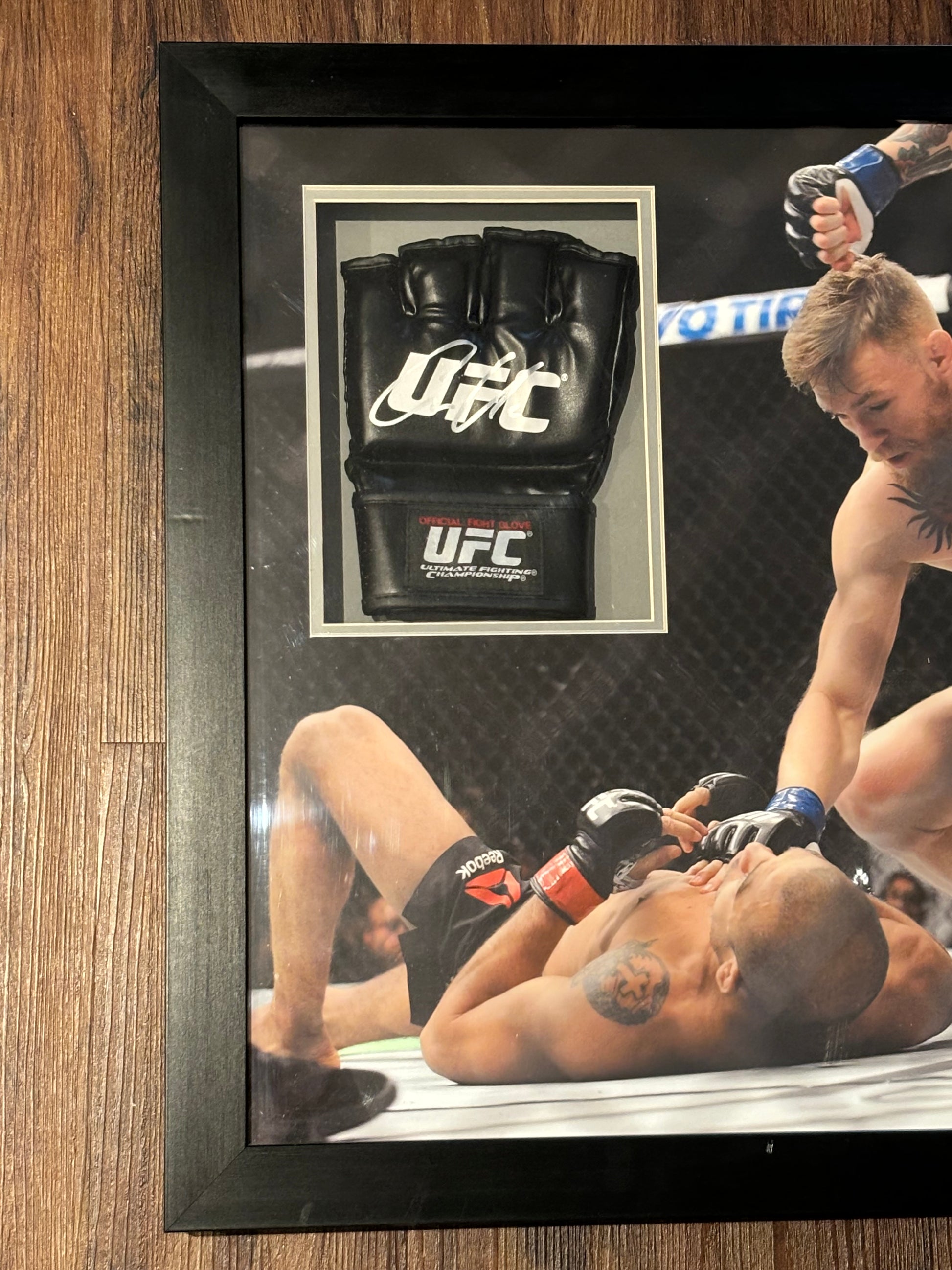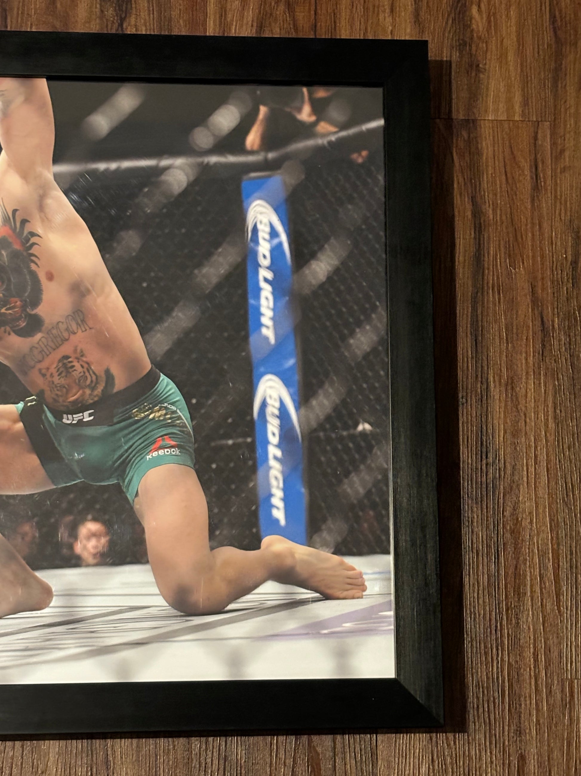 This framed UFC glove features an authentic signature from Conor McGregor, complete with a Certificate of Authenticity (COA) to guarantee its legitimacy. Perfect for collectors and fans, it offers a stylish display piece that celebrates one of the sport’s most iconic fighters.