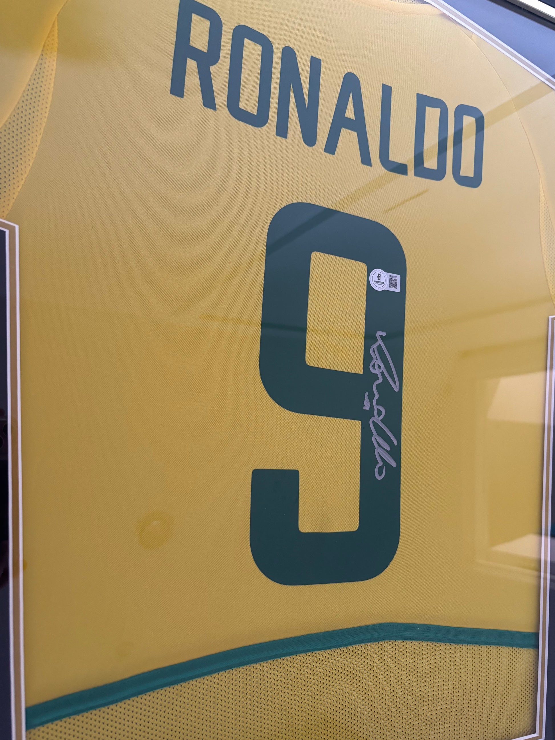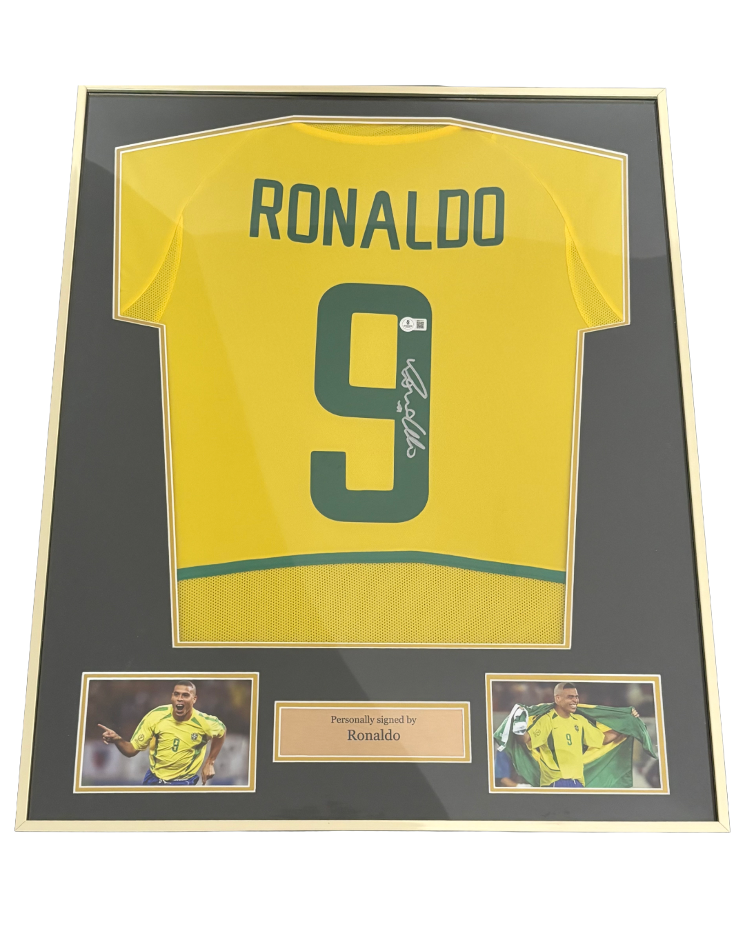 This framed Brazil shirt is signed by R9 Ronaldo Nazario, featuring an official Beckett Certificate of Authenticity with a QR hologram for verification. A perfect collectible for football fans, it combines authentic memorabilia with elegant display, making it a standout addition to any sports collection.