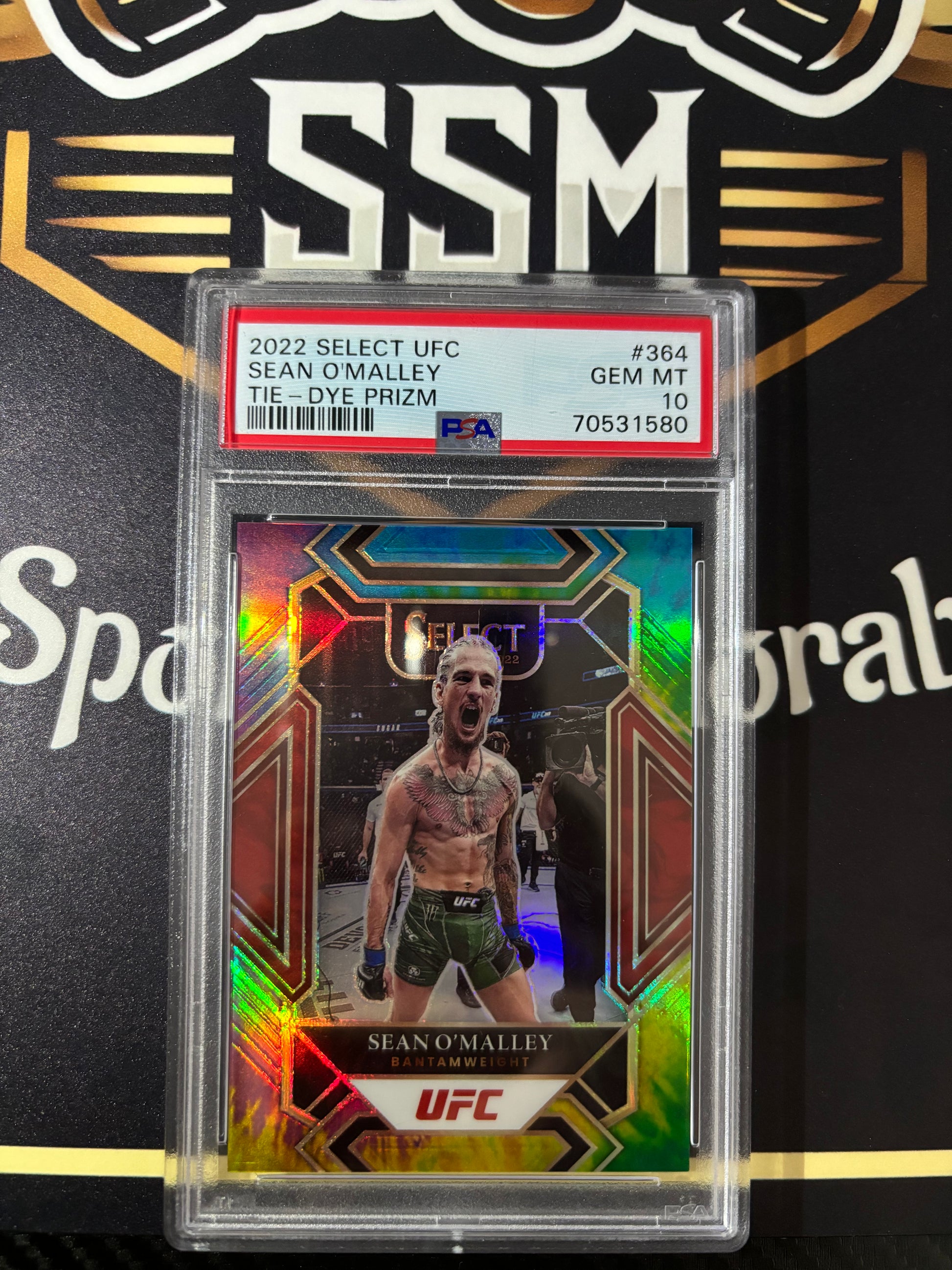 Experience the ultimate collectible with the Sean O'Malley Tie Dye card from the 2022 Select series. This PSA 10 Mezzanine card boasts a rare /25 limited edition print and encapsulates O'Malley's signature style. A must-have for any fan or collector.