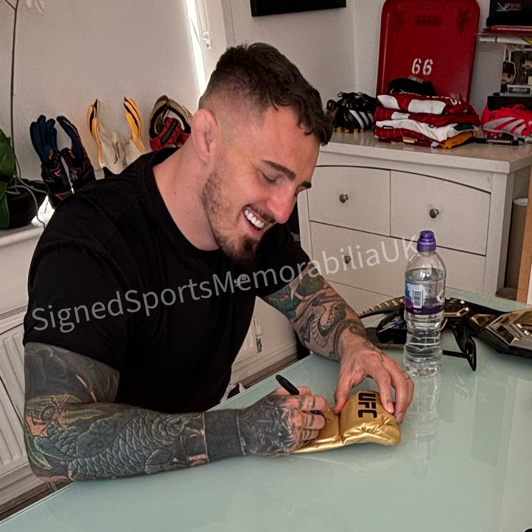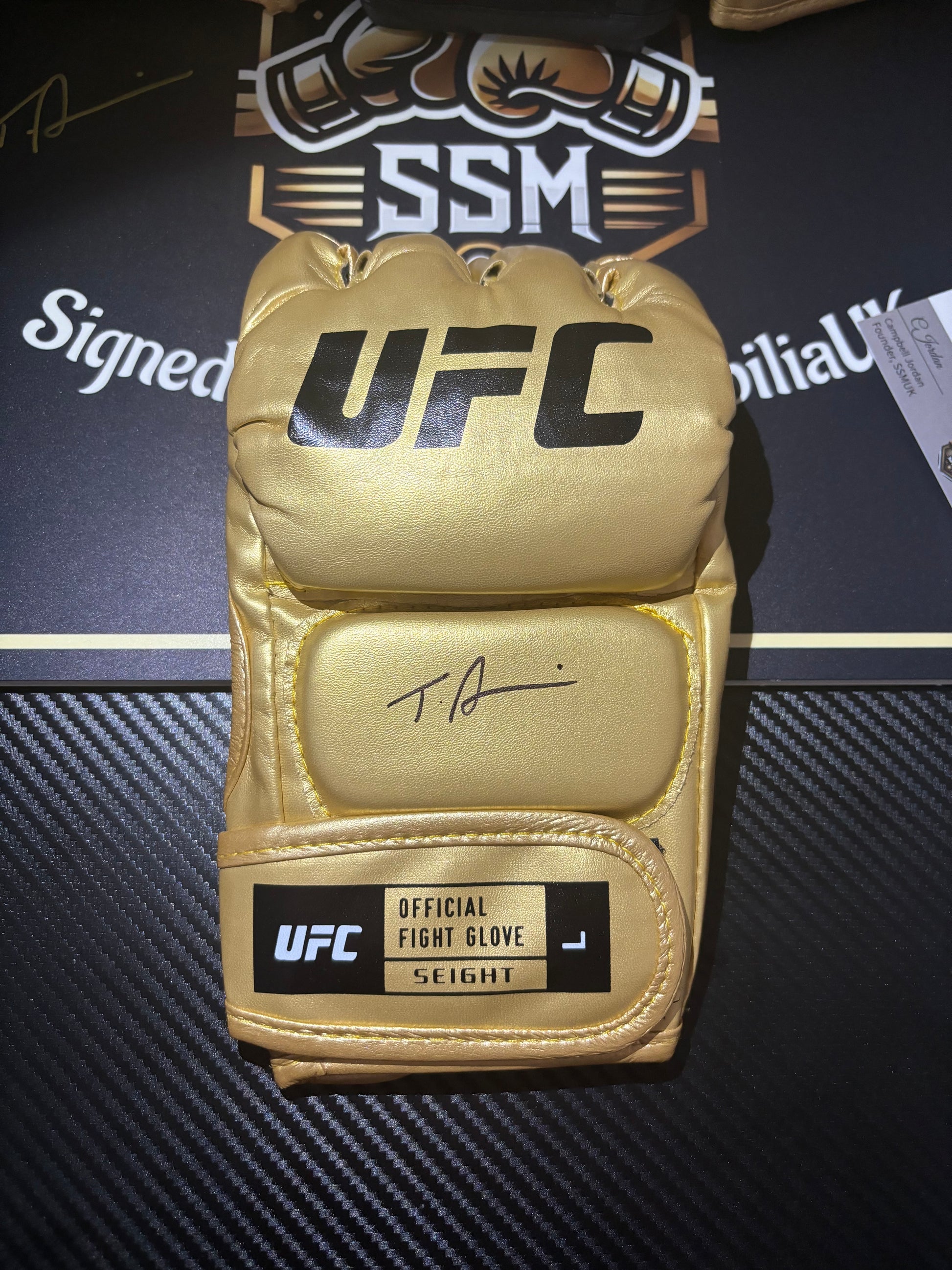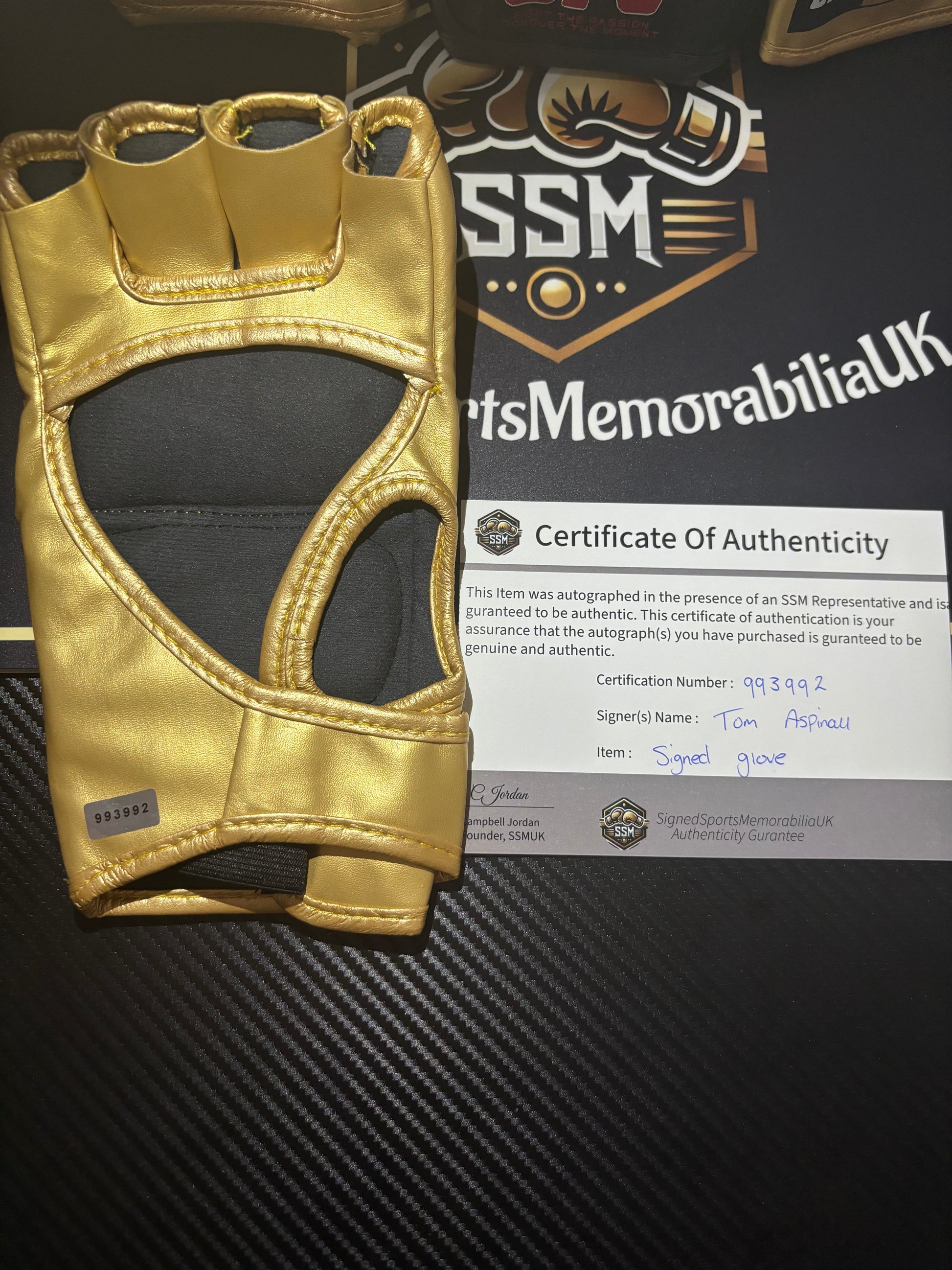 The product is a Tom Aspinall signed gold UFC glove, complete with a Certificate of Authenticity and proof from our private signing. This unique memorabilia item is autographed by the professional MMA Fighter Tom Aspinall, adding a collectible aspect to it for fans of the sport. The gloves are a rare find and come with added verification, making it a special addition to any sports memorabilia collection.