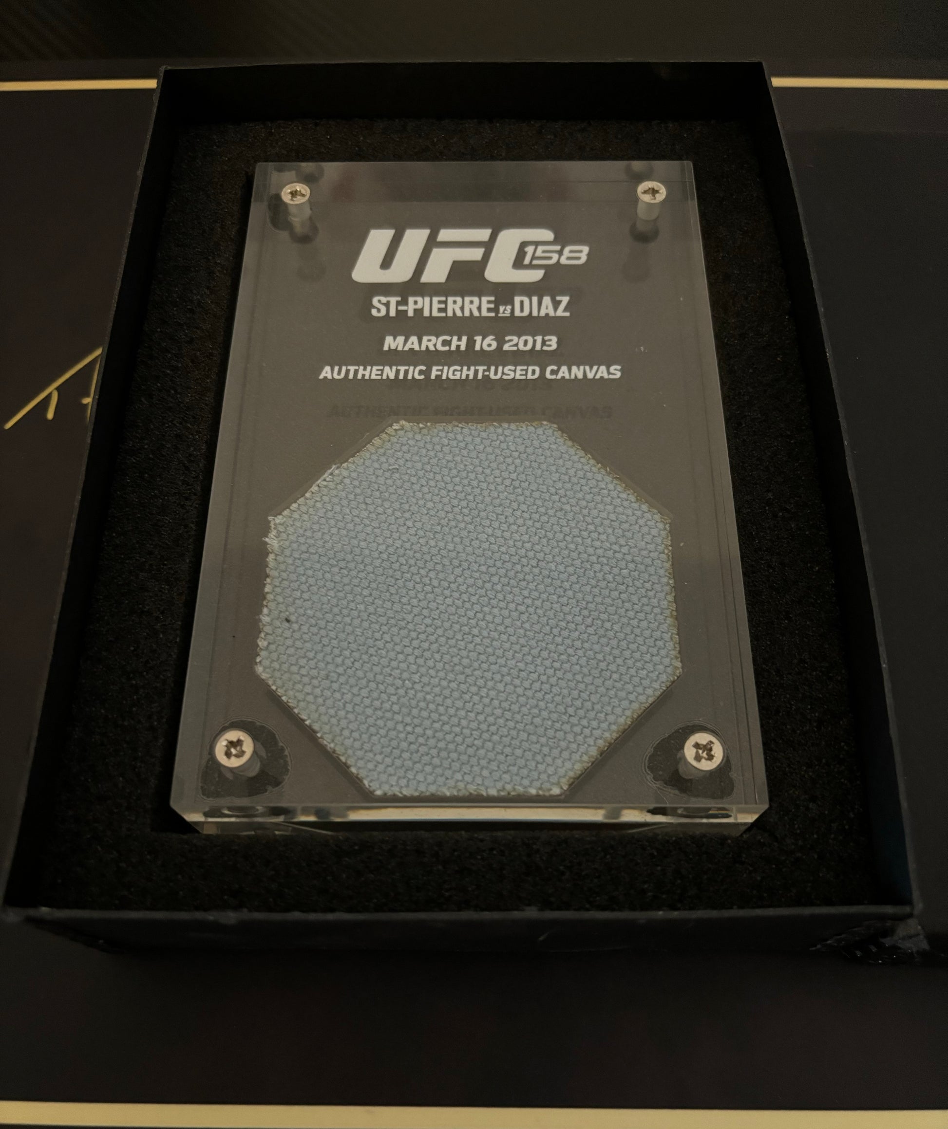 This UFC 158 event-used canvas, encased in acrylic, captures the intensity of the GSP vs. Nick Diaz fight. Preserved in a clear acrylic frame, it offers a unique piece of MMA history, perfect for fans and collectors seeking an authentic memento from this iconic bout.